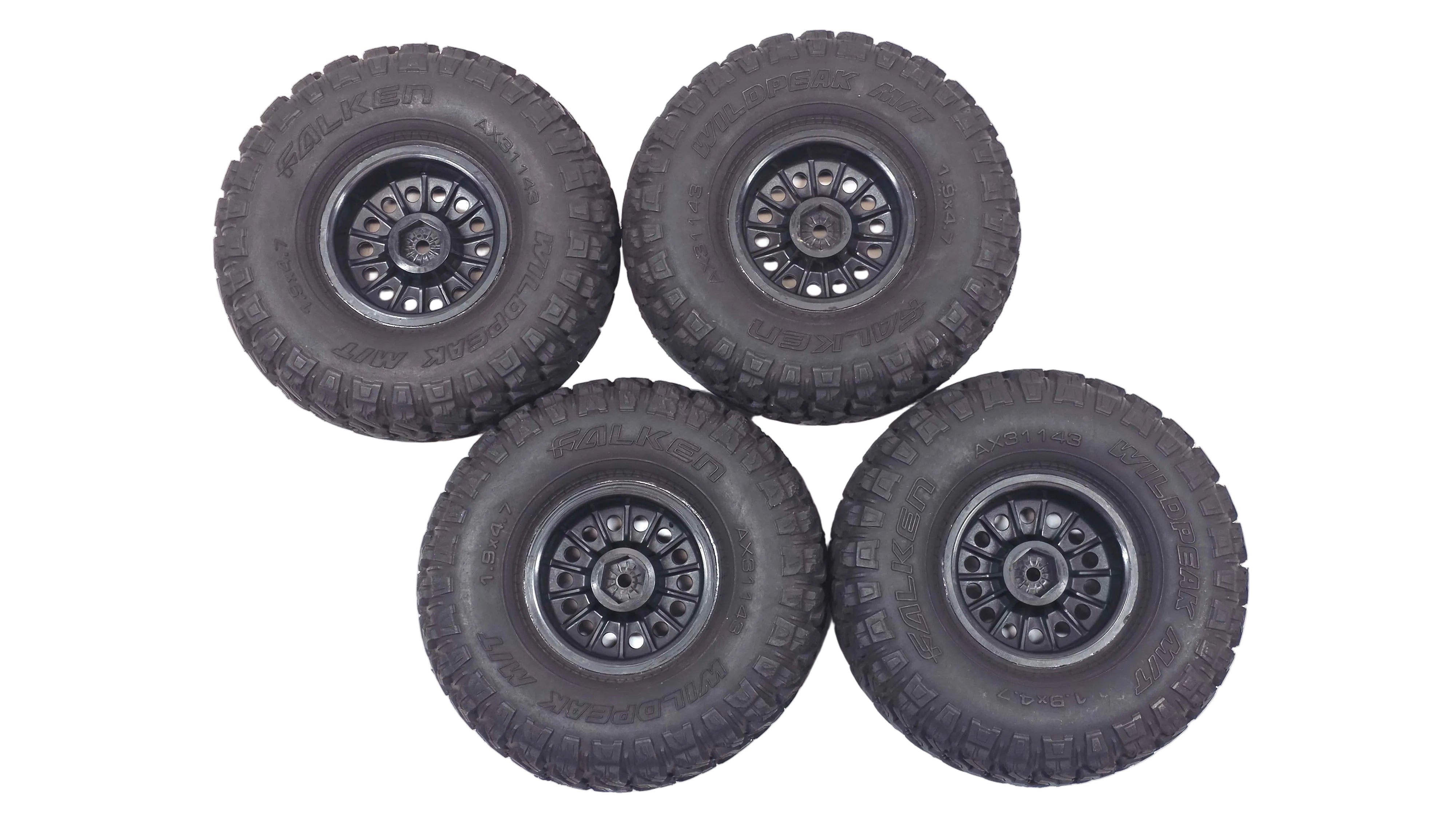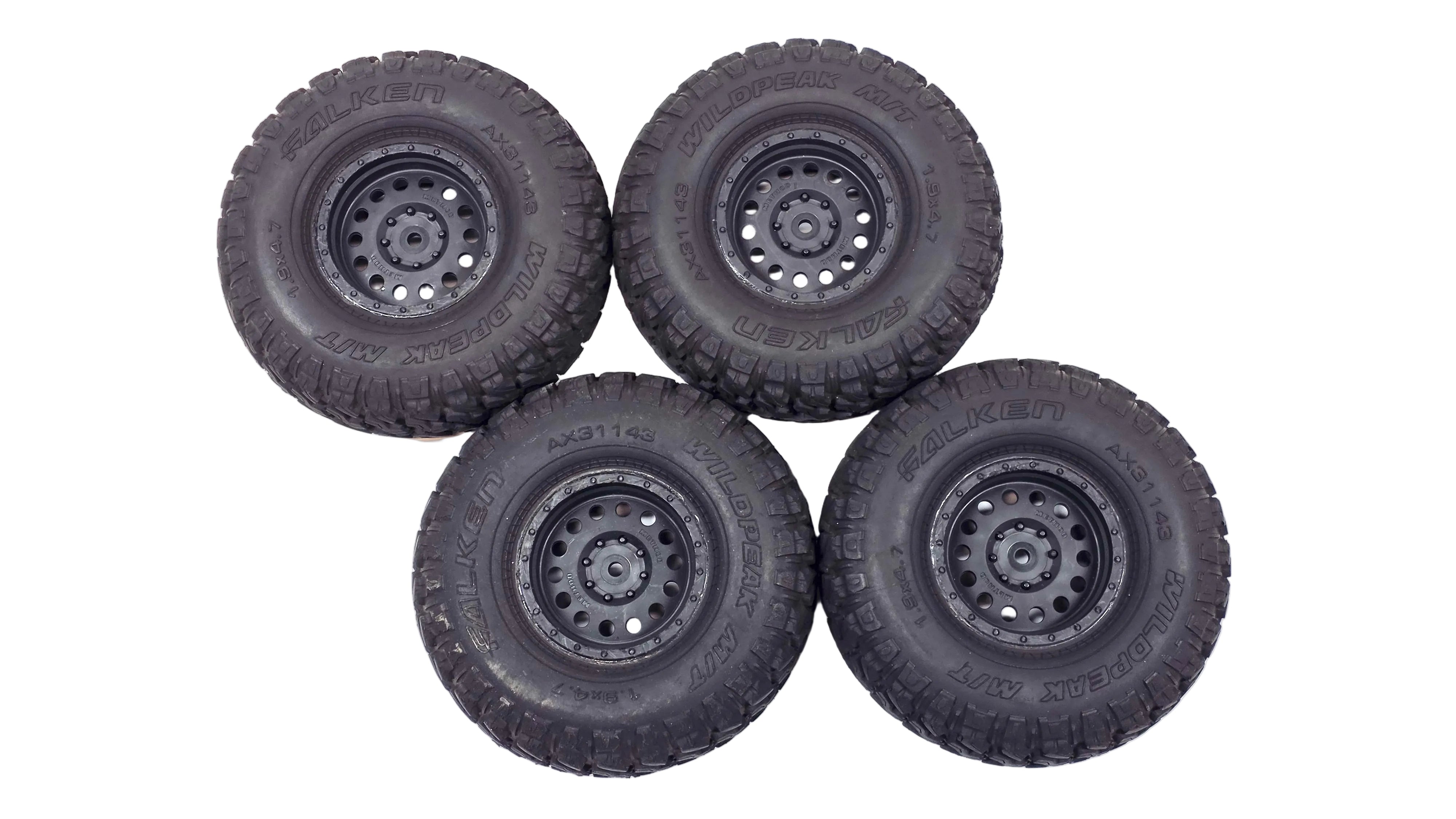 Used, Axial 1.9 Falken Wild Peak M/T Scale Tires Glued On Plastic Wheels Set of 4.