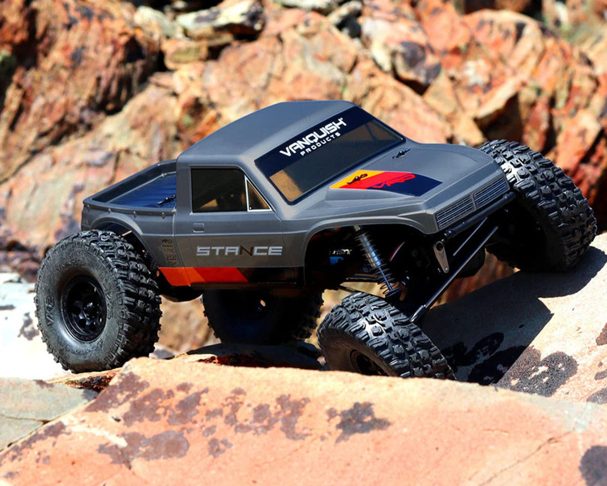 Vanquish Products Stance Competition Inspired Pickup Body. Molded from a single piece of high-quality crystal-clear polycarbonate and designed for high-performance competition while still maintaining True-to-Scale appearance, this Stance body is intended for 1/10 scale Comp rock crawlers such as the Vanquish VRD Carbon kit and axial SCX10 Pro! Features a 12.3" wheelbase to fit most 1/10 platforms on the market with a tucked narrow fenders design to provide all the clearance needed for the tire's articulation with no body rubbing! Get this Stance body to elevate your comp kit performance and scale appearances!