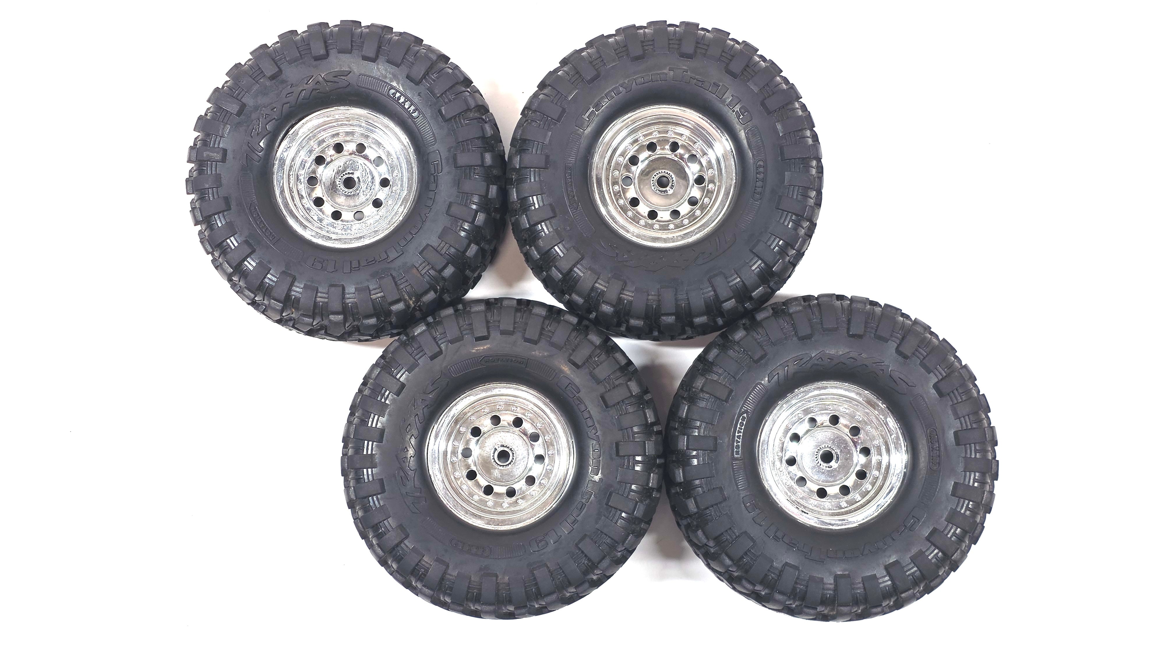 Used, Traxxas TRX4 1.9 Canyon Trail Tires Glued To Plastic Chrome Wheels Set of 4.