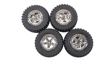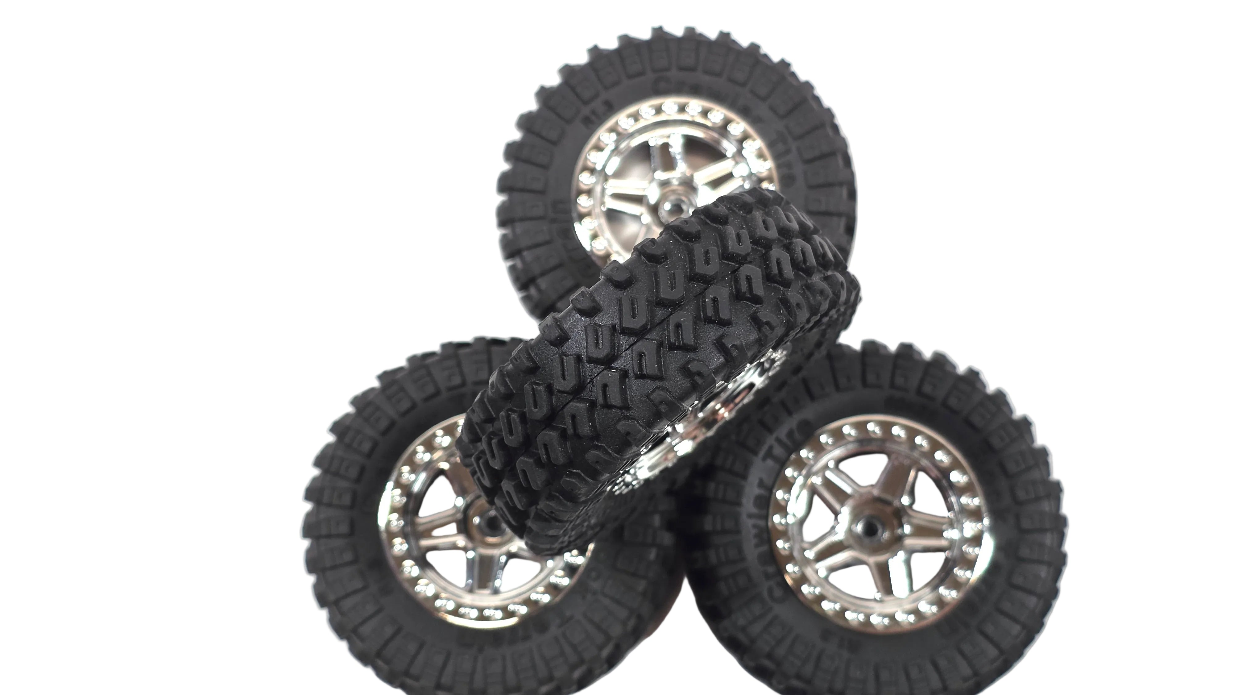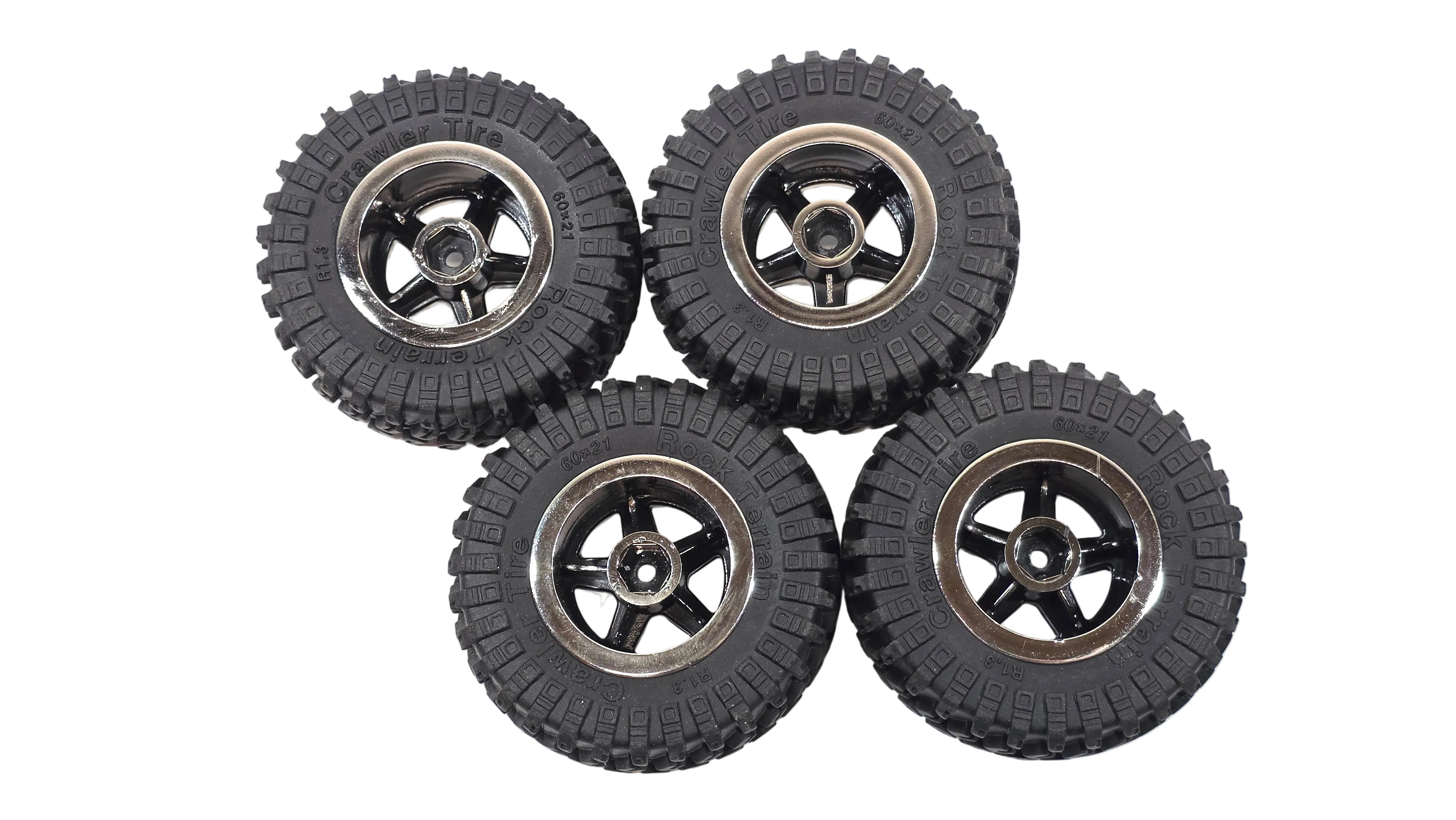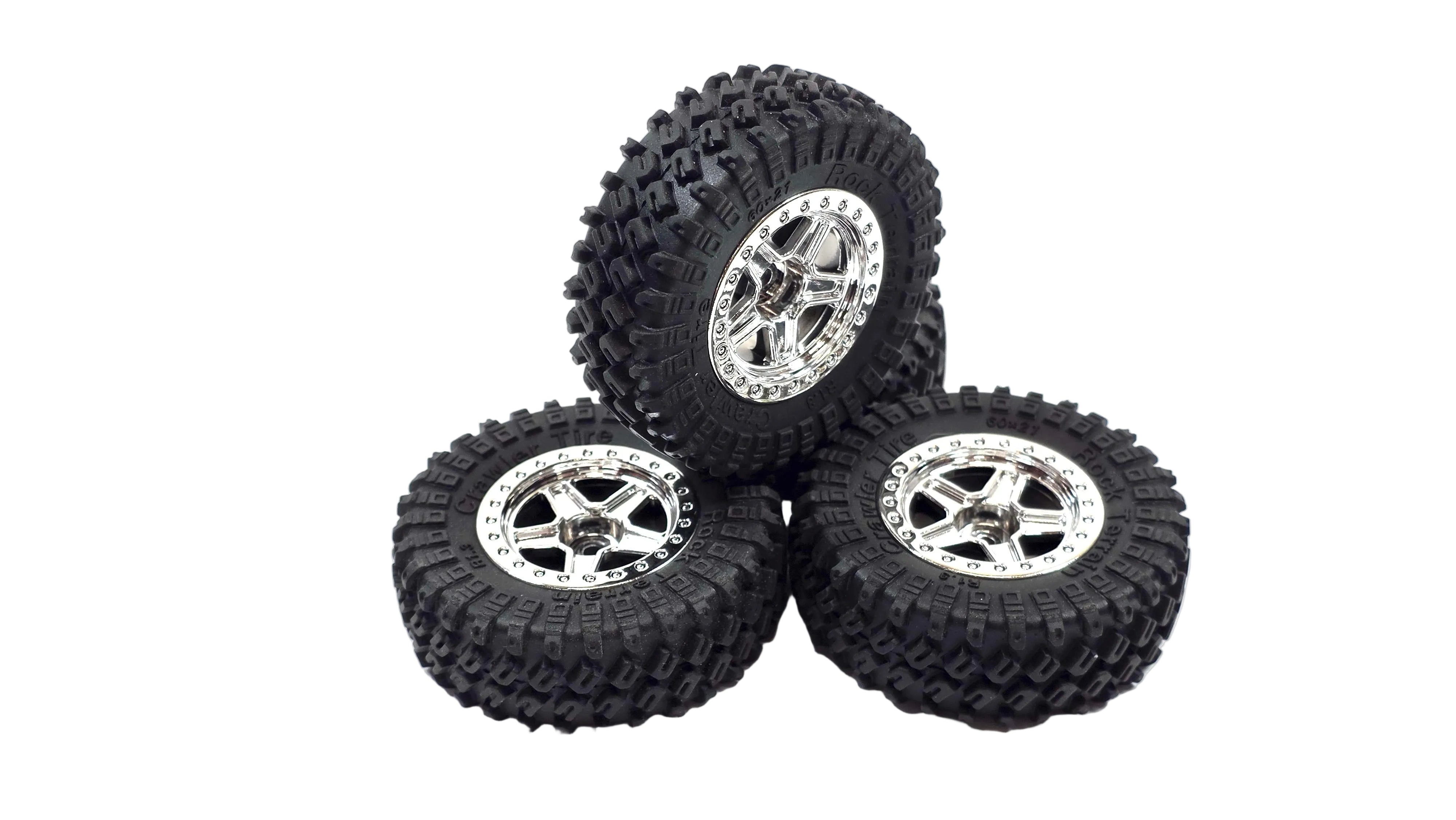 Set of 4 1.3 Crawler Tire Rock Terrain Scale Mini Tires & Chrome Wheels (Un-Glued)