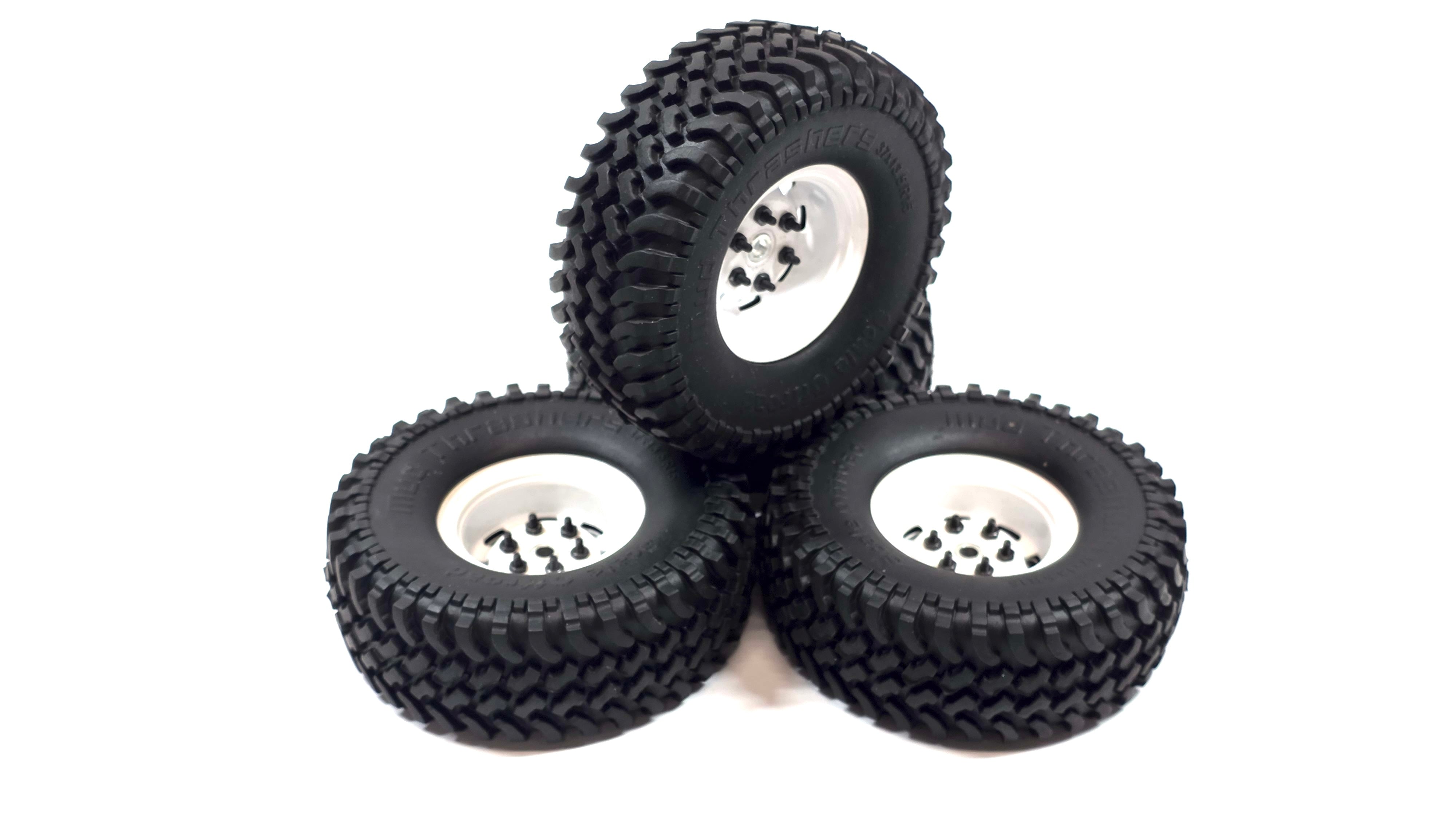 Used, RC4WD 1.55 Mud Thrasher Scale Tires w/ 1.55 Steelie Wagon Wheel Style Bead Locks 12mm Hex.
