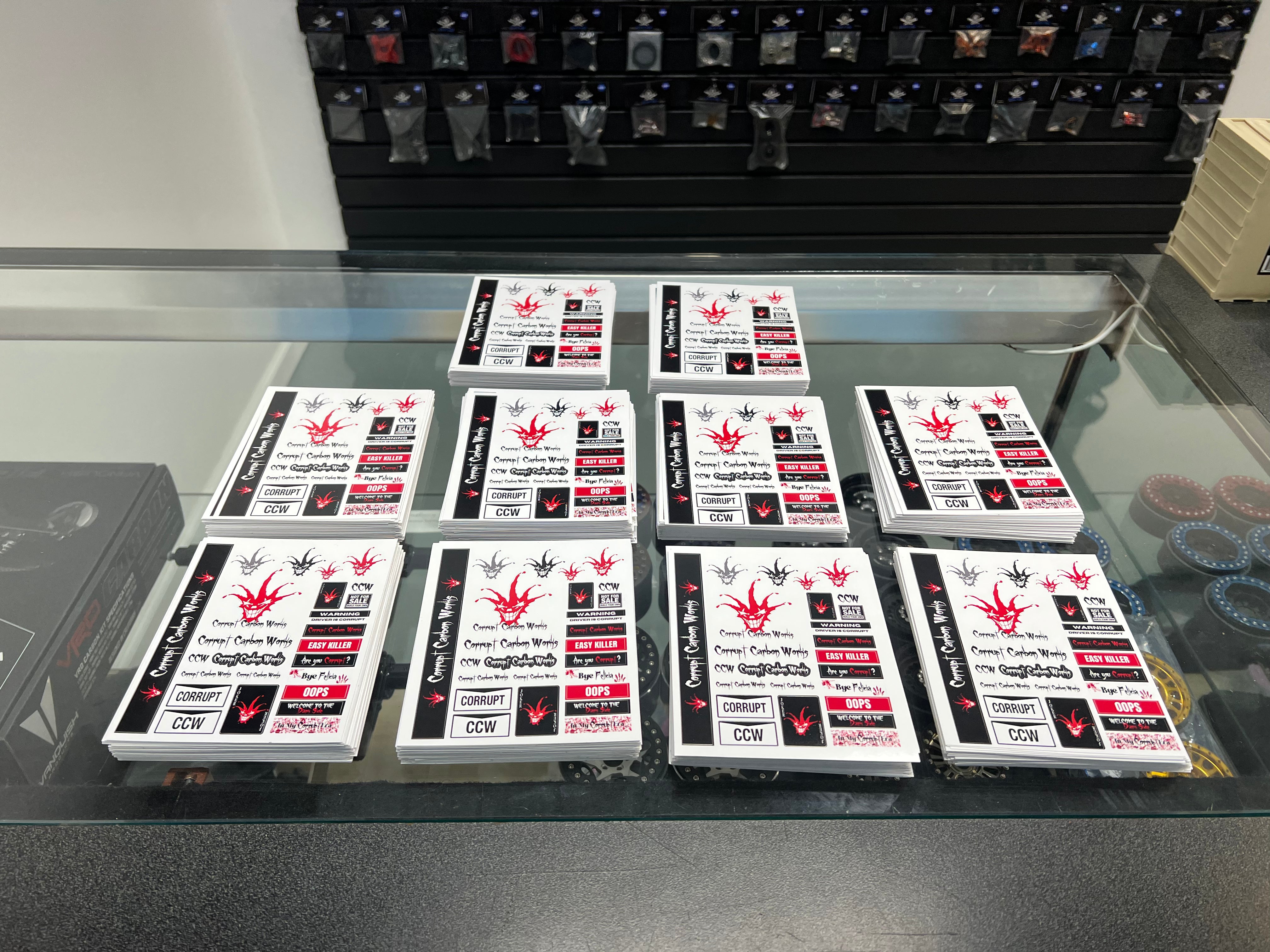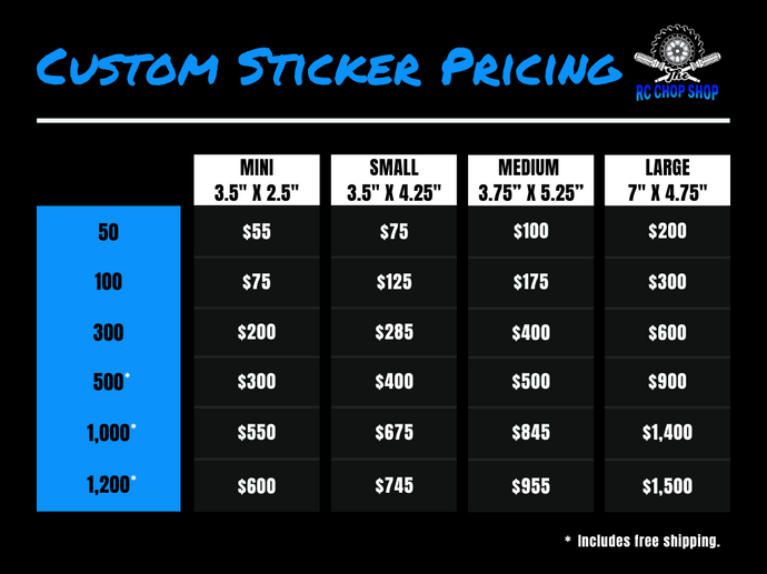 Right now we are offering bulk sticker orders of at least 50 sheets or more. If you have stickers you would like to have made in a smaller batch please contact us at kennedy@thercchopshop.com.